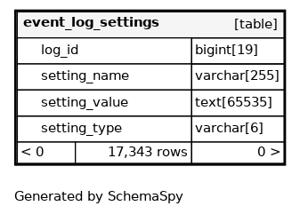 | event_log_settings_name_value | Performance | Asc/Asc | setting_name + setting_value |