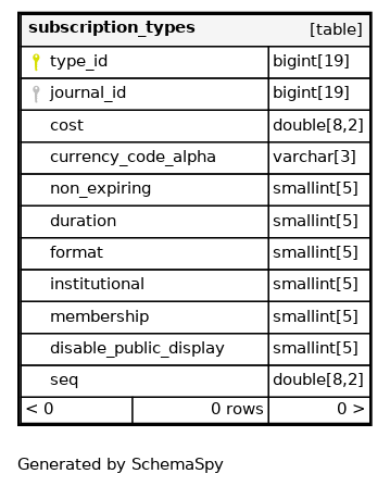 | Column | Type | Size | Nulls | Auto | Default | Children | Parents | Comments | |||